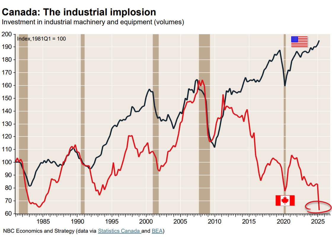 The US has become unpredictable, from trade to security. The future of USMCA is in the air. After the raid on Nicolas Maduro in Caracas, the return of Venezuelan oil could sideline Canadian oil exports to the US (around 97% of Canadian oil is purchased by America). Add to this, US threats to annex Greenland are reigniting fears that “51st state” rhetoric (or action) may return. Canada needs to reorient, fast. And, not just because of geopolitics. Canada’s economy is in turmoil. It is the worst-performing G7 economy. According to the OECD, Canada will be the worst-performing advanced economy of the 2020s - and decades after that. And, a new chart from the National Bank of Canada (below) shows how Canada’s industrial activity is plummeting in comparison to America.
