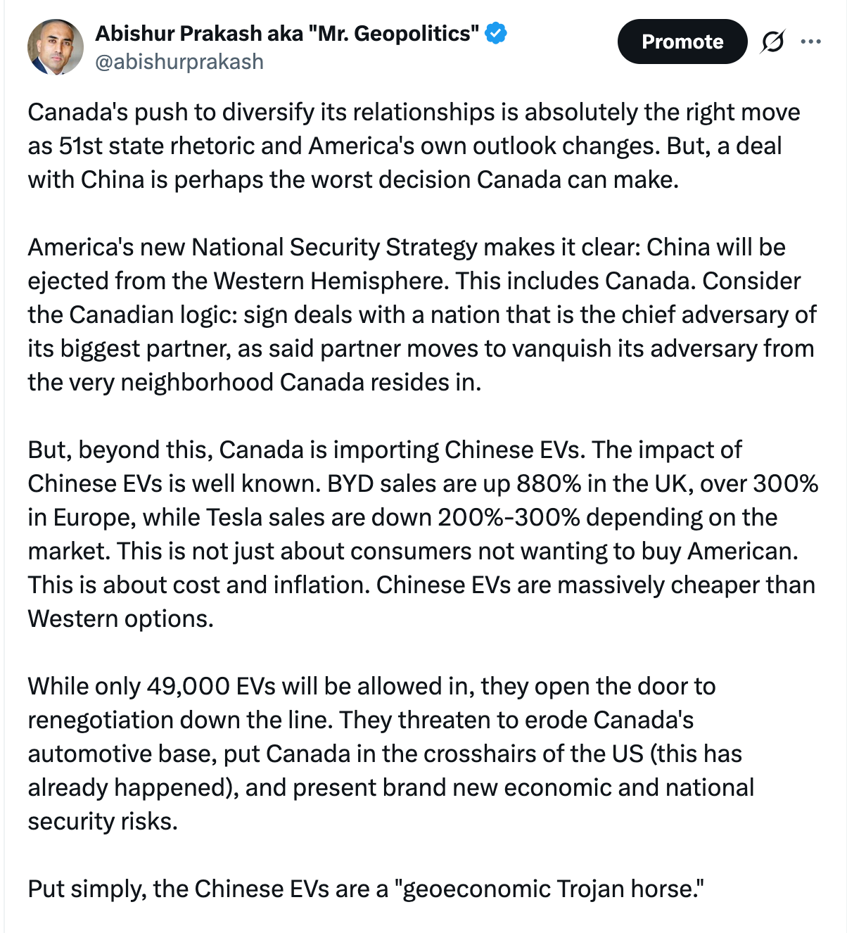Ever since 51st state rhetoric began, on paper, Canada has been diversifying its relationships. Last week, Carney was in China, where he signed a highly controversial deal to allow Chinese EVs into the nation, a geoeconomic trojan horse by all measures. In March, Carney will visit India and Australia, seeking to establish a new link in Asia.